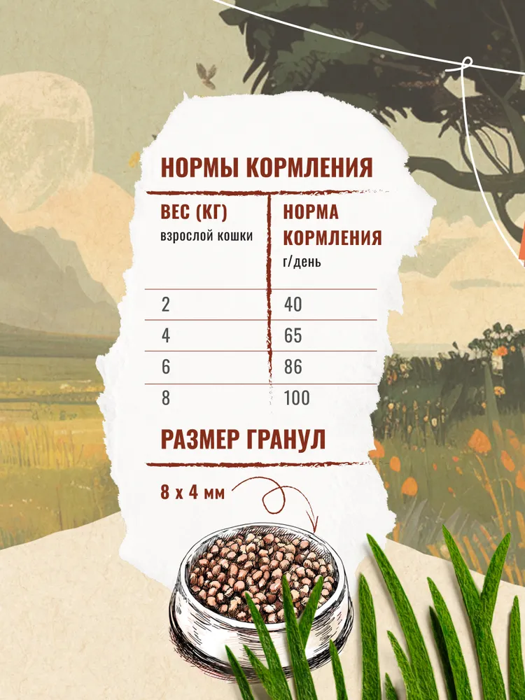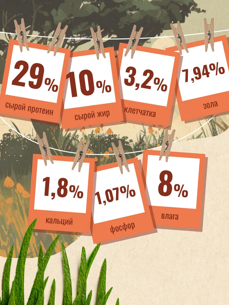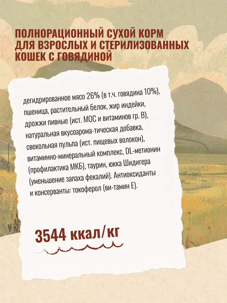 дегидрированное мясо 26% (в т.ч. говядина 10%), пшеница, растительный белок, жир индейки, дрожжи пивные (ист. МОС и витаминов гр. В), натуральная вкусоароматическая добавка, свекольная пульпа (ист. пищевых волокон), витаминно-минеральный комплекс, DL-метионин (профилактика МКБ), таурин, юкка Шидигера (уменьшение запаха фекалий). Антиоксиданты и консерванты: токоферол (витамин Е). -