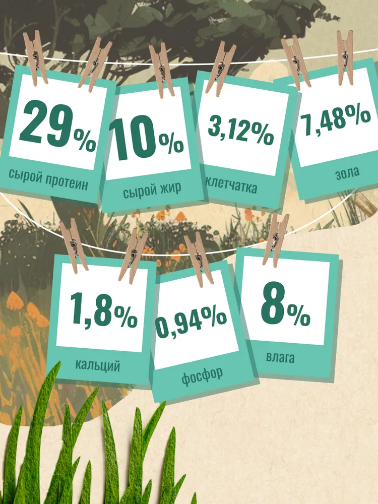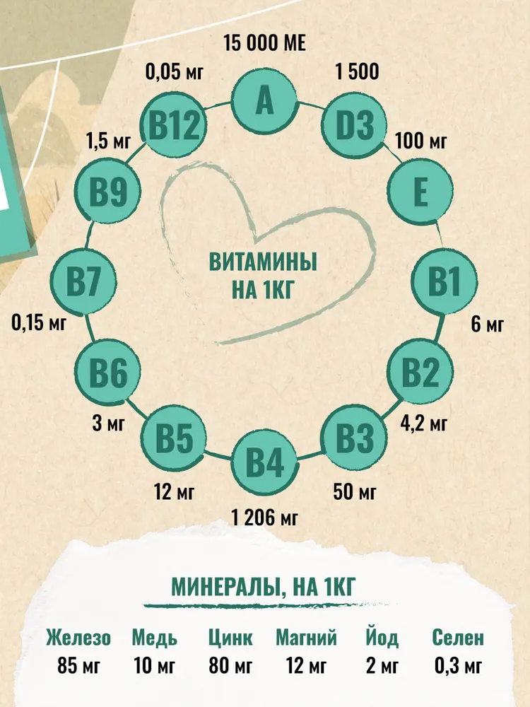 дегидрированное мясо 20%, дегидрированная рыба 10%, пшеница, жир индейки, дрожжи пивные (ист. МОС и витаминов гр. В), натуральная вкусоароматическая добав-ка, свекольная пульпа (ист. пищевых волокон), витамин-но-минеральный комплекс, DL-метионин (профилактика МКБ), таурин, юкка Шидигера (уменьшение запаха фека-лий). Антиоксиданты и консерванты: токоферол (витамин Е). -