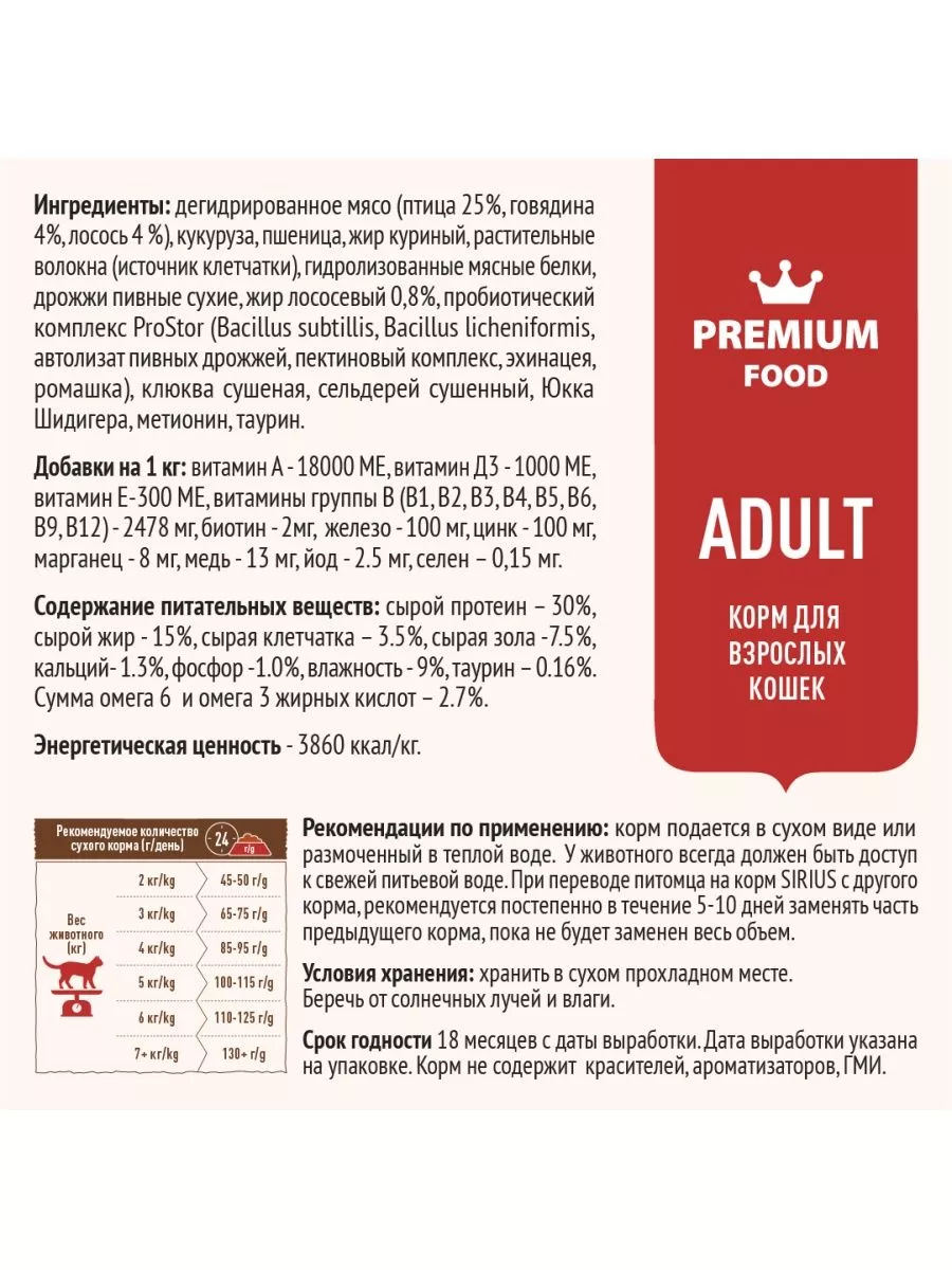 SIRIUS — сухой корм премиум-класса для полноценного ежедневного рациона взрослых кошек.