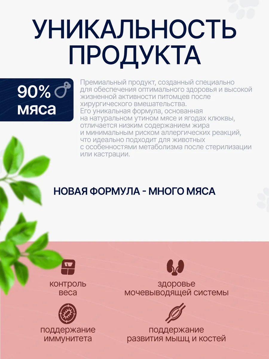 Гипоаллергенный состав. Основу составляет высокоусвояемая утиная грудка (30%), которая редко вызывает аллергию и хорошо воспринимается пищеварительной системой.