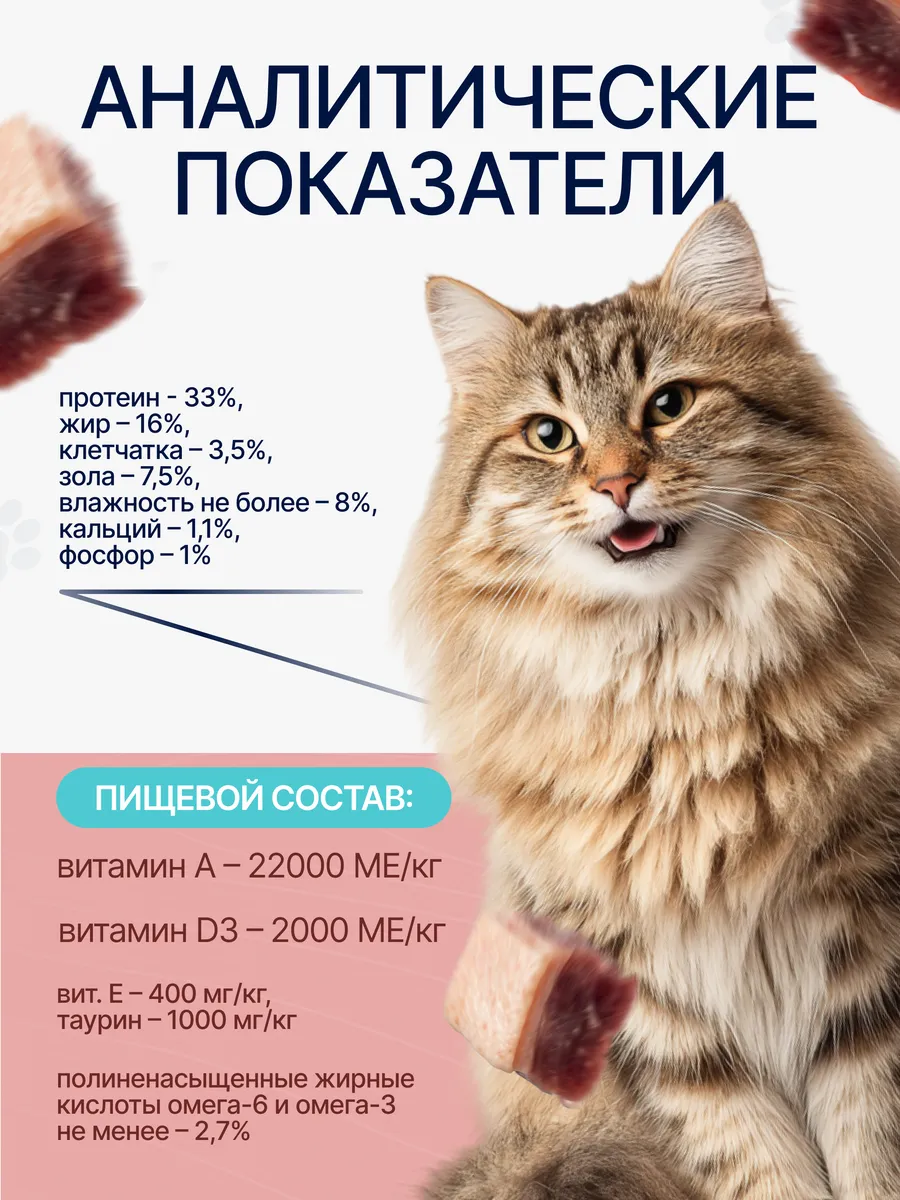 Аналитический состав: сырой белок — 37%, сырой жир — 13%, влага — 5%, сырая зола — 5,5%, сырые волокна — 2,5%, кальций — 1,5%, фосфор — 1,1%.