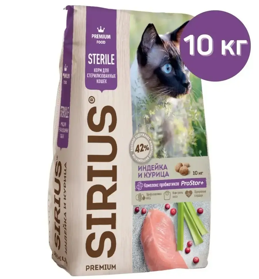 SIRIUS для взрослых кастрированных и стерилизованных кошек с индейкой и курицей 10кг