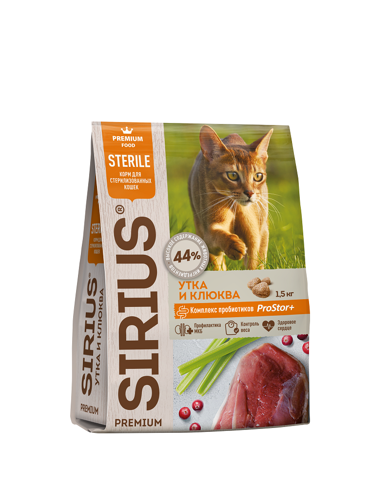 SIRIUS для взрослых кастрированных и стерилизованных кошек с уткой и клюквой 10кг