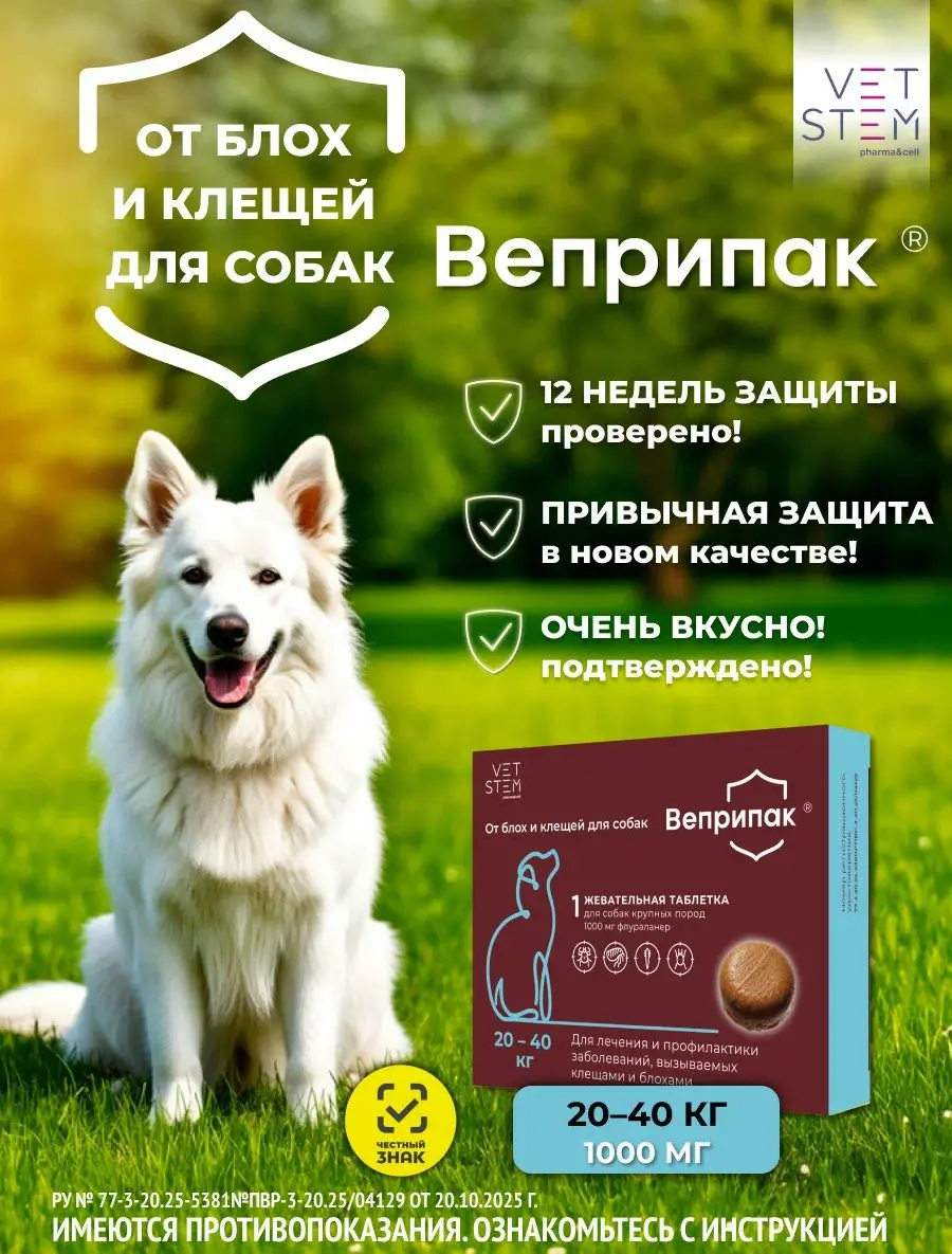 Веприпак 1000 мг, Таблетка от блох и клещей для собак весом 20-40 кг, 1 таб./уп.