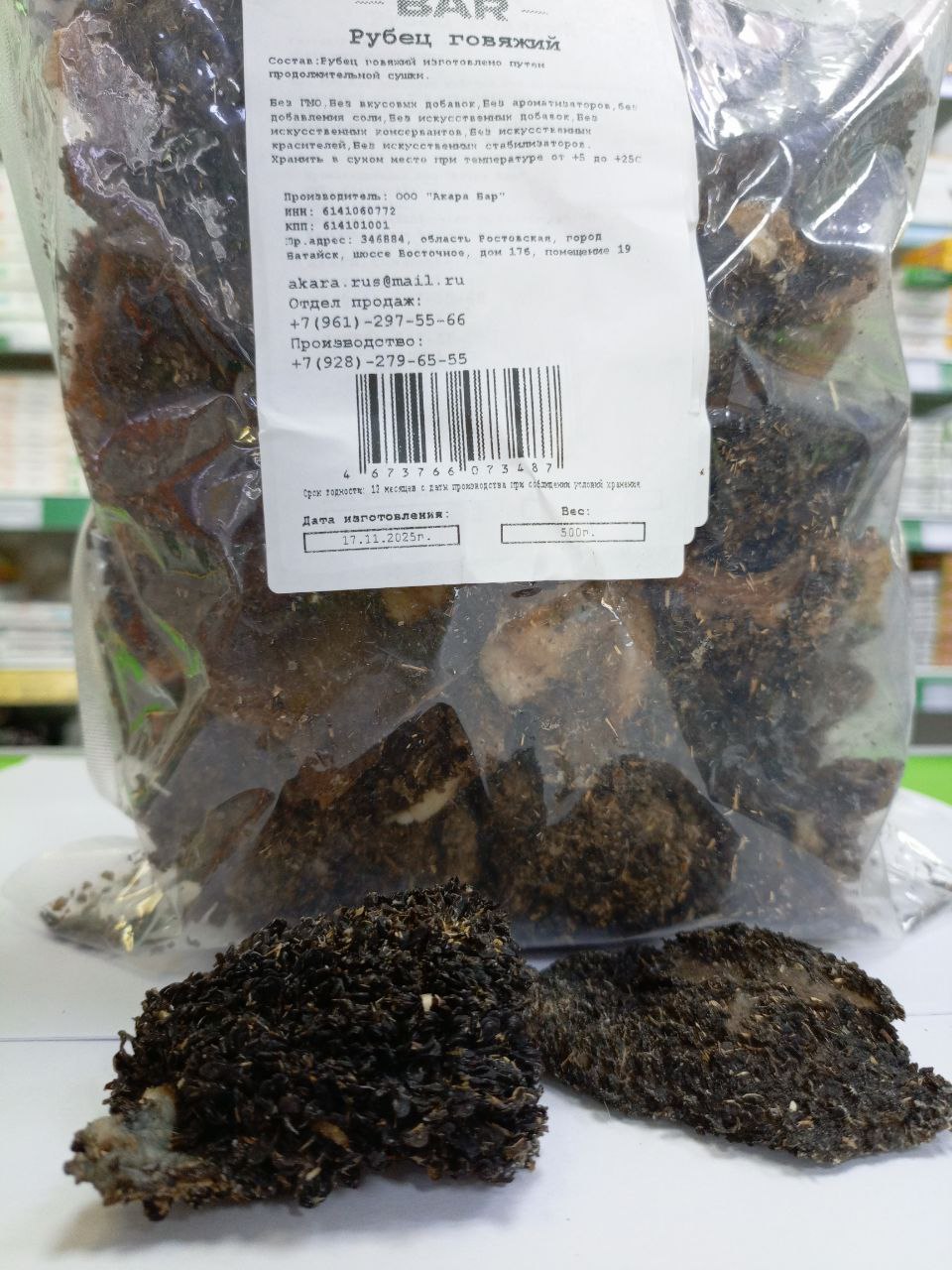 Лакомство AKARA BAR «Рубец говяжий» в упаковке 500 г — это сушёный рубец (часть желудка коровы), который используется как натуральное лакомство для собак. Рубец содержит множество полезных веществ и способствует поддержанию здоровья питомца.