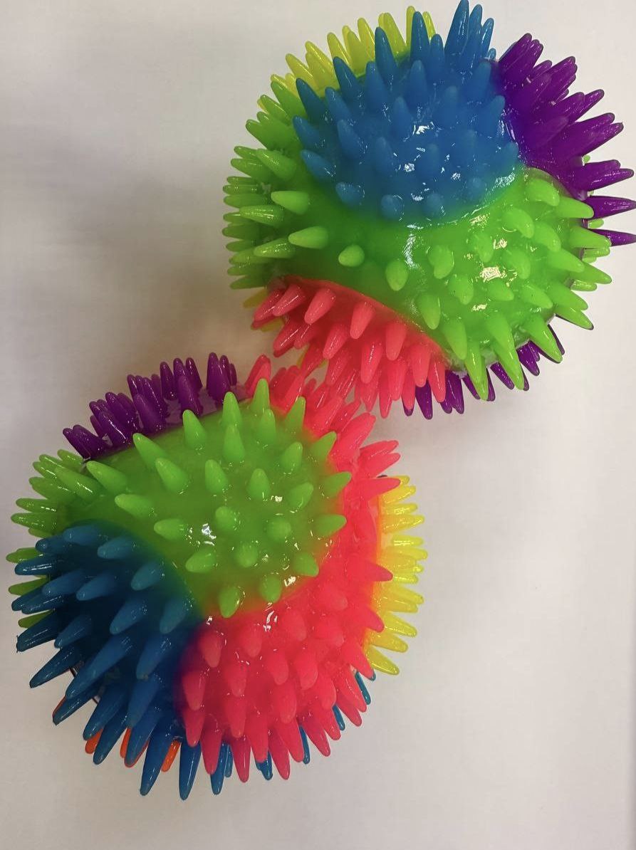 Игрушка для собак. Привлечёт внимание вашего питомца и станет отличным развлечением для него. Размер мяча — 10 см. Светящийся элемент добавляет оригинальность и делает игрушку заметной в темноте. Шипы стимулируют интерес собаки и помогают очищать зубы питомца, массируя дёсны во время игры.