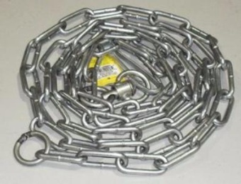 Прочная стальная цепь отлично подходит для содержания собаки на определенной теpритории. С одной стороны цепи прикреплено кольцо которое крепится к тросу или другому фиксатору. С другой стороны цепи есть карабин, который надевается на ошейник собаки.