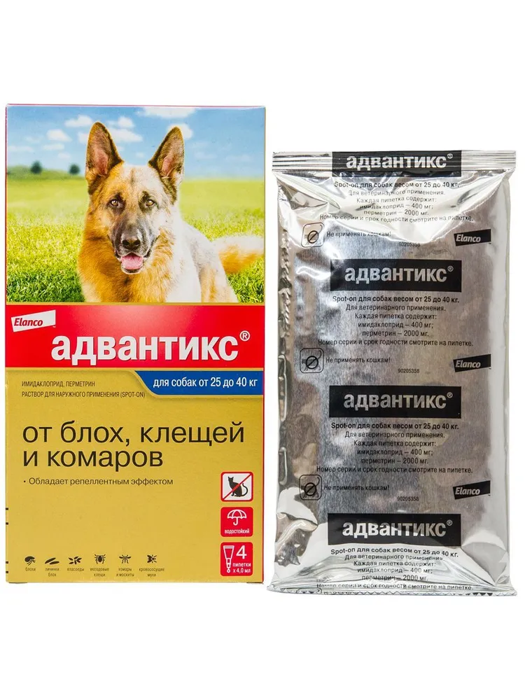Адвантикс® - препарат от компании Elanco, помогает защитить собаку до укуса от самых распространенных представителей рода иксодовых клещей в России, от блох и назойливых комаров, москитов и мух – переносчиков опасных заболеваний, а также аллергических реакций на их укус.