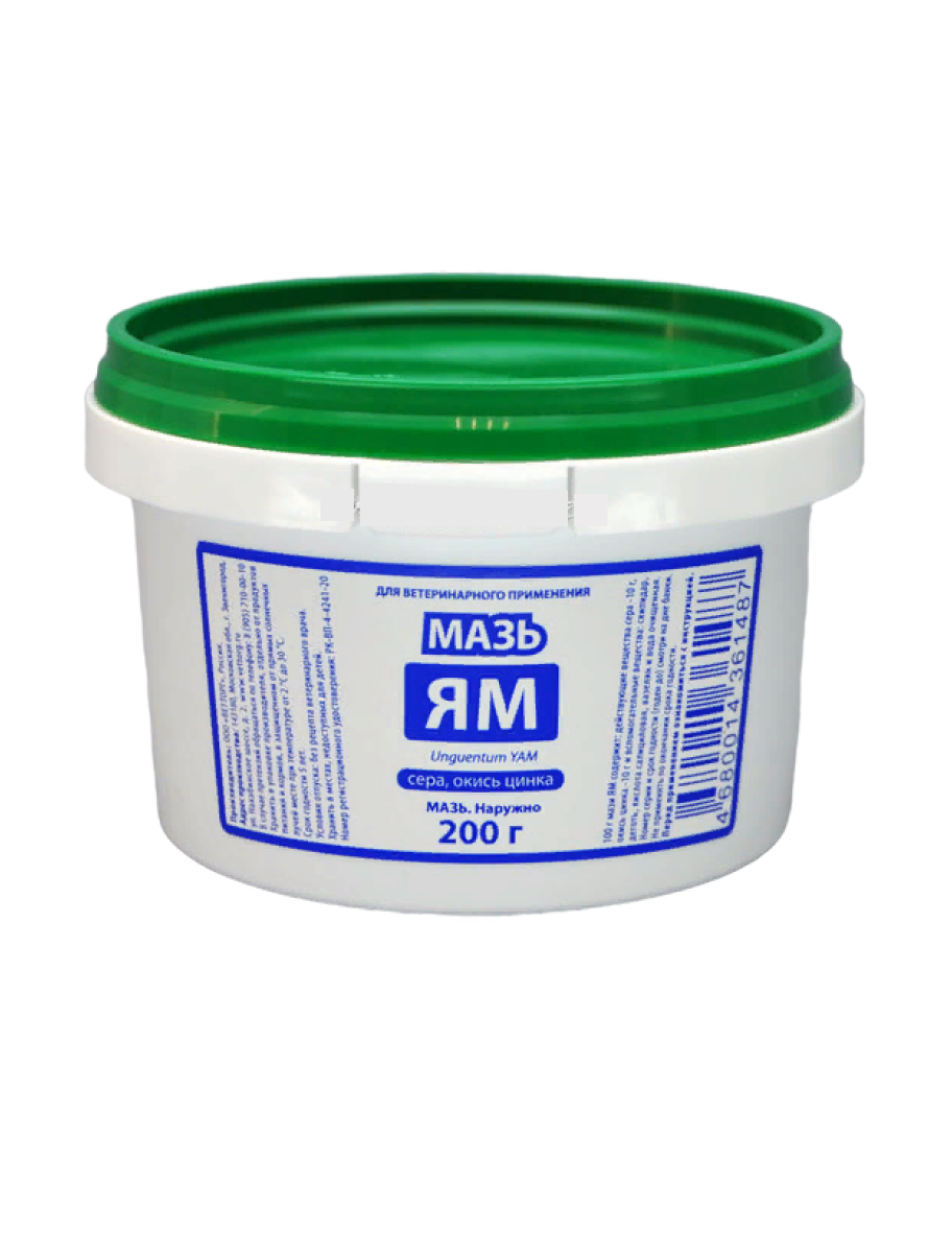 Мазь ЯМ применяют для лечения заболеваний кожи животных: экзема, трихофития, дерматиты, вызванные саркоптоидными и псороптоидными клещами.