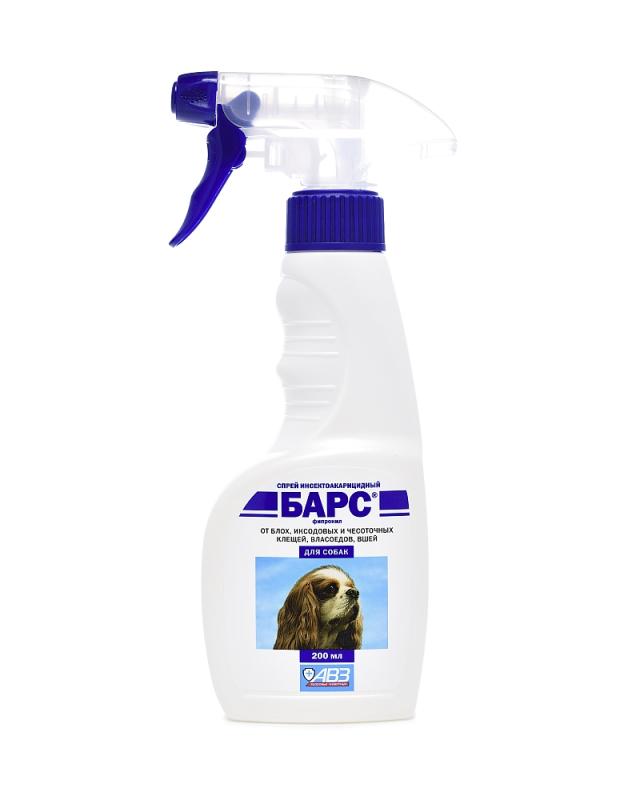 Спрей «Барс» эффективен против блох, вшей, волосовиков (власоедов), иксодовых и саркоптоидных клещей, паразитирующих на собаках и кошках. Препарат обладает системным и контактным действием, вызывая гибель паразитов сразу после их нападения на обработанное животное. Спрей имеет приятный запах и оказывает репеллентное действие.